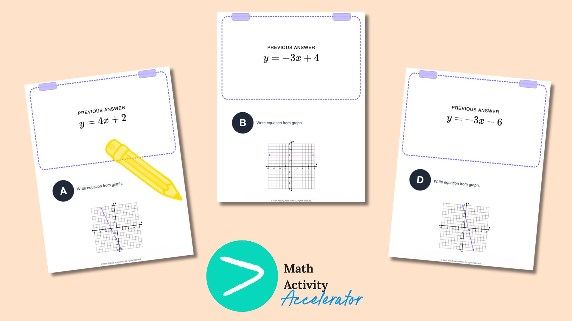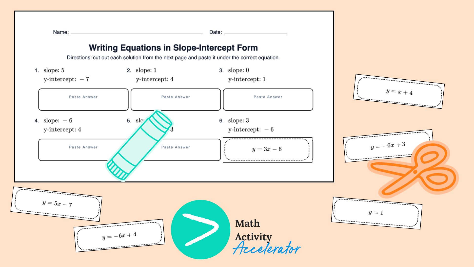 We focus on identifying the pieces—what is the starting point (y-intercept), and what is the change (slope)? Using matching activities here helps students recognize the structure before they have to create it themselves. A great way to build this recognition is through linear equations matching activity like the ones you can instantly create and customize with the Math Activity Accelerator.