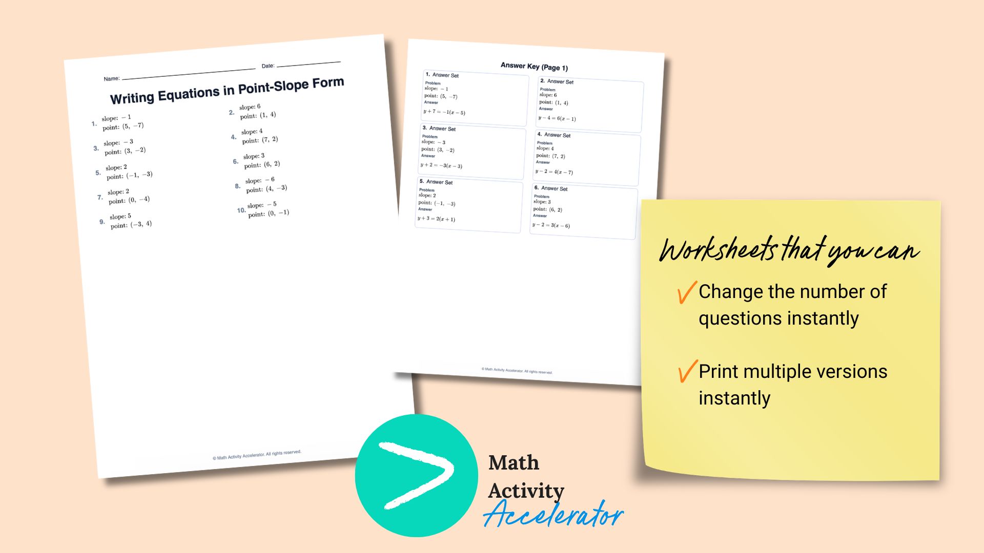 Point slope form is both fun and confusing. Using an engaging activity like a scavenger hunt or cut and paste is a great way to get students making the connections between standard form, slope-intercept form, and point slope form. You can instantly create all of these activities for point-slope form and create point slope form PDF for free when you sign up for the Math Activity Accelerator free plan.