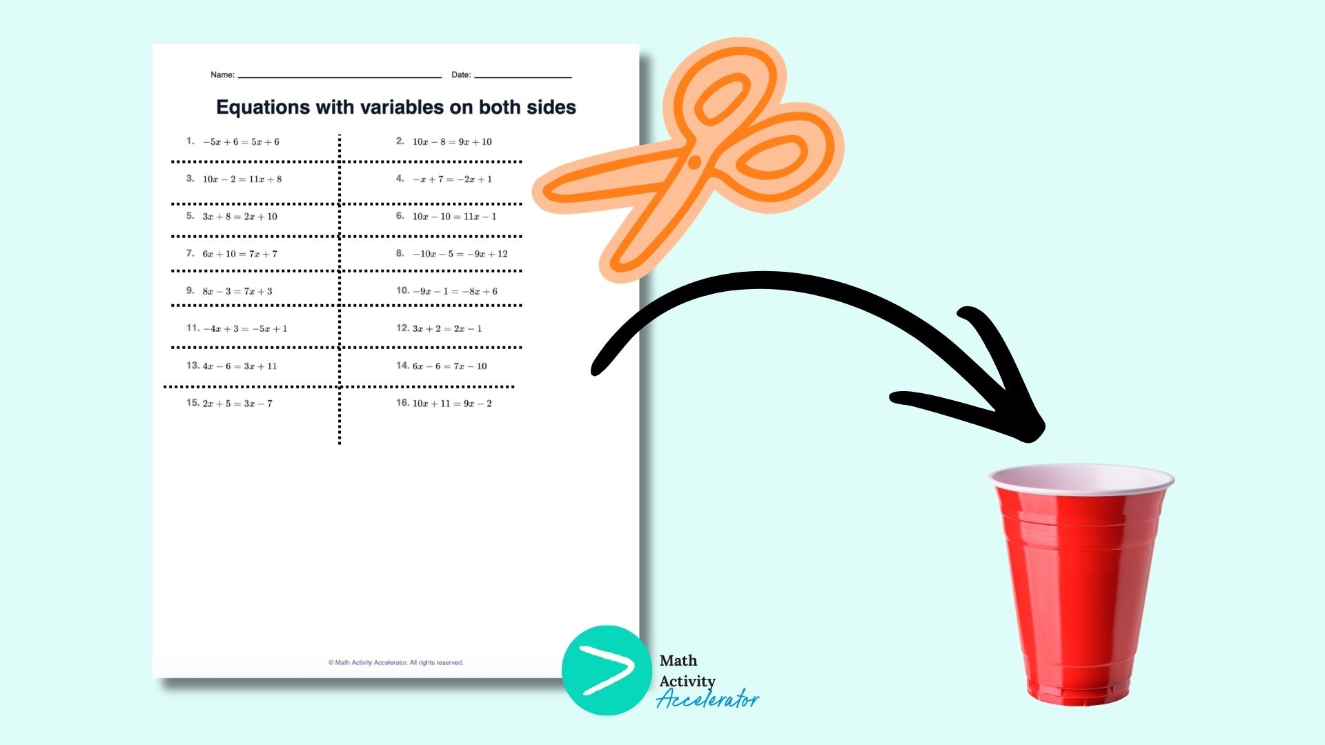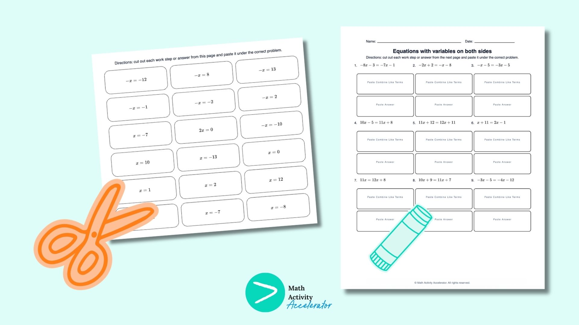 Cut and paste activities - like these that you can generate and customize with one click - are great for solving equations with the variable on both sides, also called solving equations with the variable on both sides matching activity. I love using a cut and paste activity for this content because students can work in partners to have math discussions about solving equations with the variable on both sides, which is helpful since it’s a challenging concept for students to grasp. Matching activities are kinesthetic which is helpful for students who need to move more in our classes.